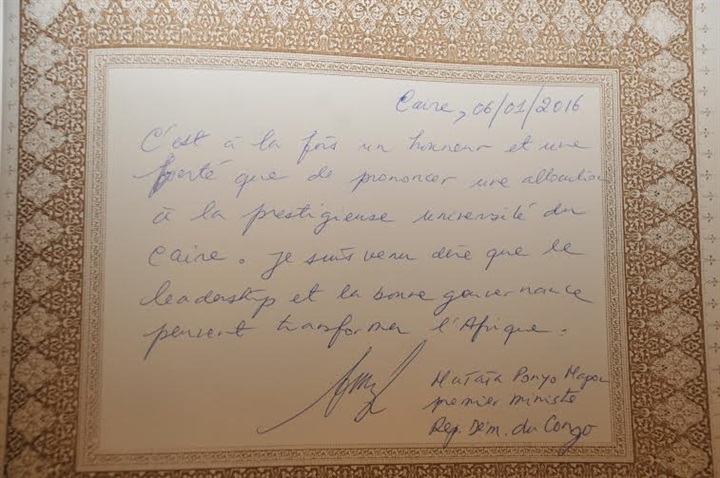 وعقب إلقاء رئيس وزراء الكونغو الديمقراطية، كلمته بحضور وزير الموارد والري ووزير البيئة وعدد من الشخصيات العامة وعدد من السفراء والدبلوماسين وأساتذة جامعة القاهرة والطلاب، أهدى الدكتور جابر نصار رئيس جامعة القاهرة، درع قبة الجامعة تقديرًا له، كما سجل رئيس الوزراء الكونغولي كلمه في السجل التذكاري لجامعة القاهرة.