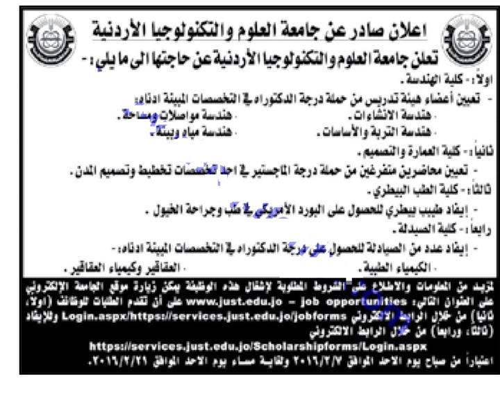 تعلن جامعة العلوم والتكنولوجيا الأردنية عن حاجتها للتعاقد مع أعضاء هيئة التدريس وذلك في التخصصات التالية: