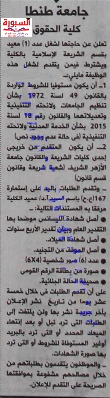 تعلن جامعة طنطا عن حاجتها للتعاقد مع أعضاء هيئة التدريس وذلك وفقا للتخصصات التالية:
