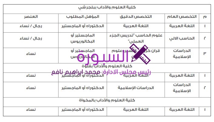 تـعلن جـامعة البـاحة عن رغبـتها في التـعاقد بنظـام المحـاضرة للفصل الدراسي الثاني فقط للعام الجامعي 1436/1437هـ بكلية العـلوم والآداب ببلجـرشـي وقلوة والمخـواه في التـخصصــات المحـددة بالـجـدول وذلك للحـاصـــليـن عــلى (درجــة الدكتـوراه أو الماجستير في تخصص اللغة العربية والدراسات الاسلامية والماجستير أو البكالوريوس في تخصص علوم الحاسب) من المواطنين والمواطنات وستعطى الافضلية في التـعاقد لمن لديـهم خبـره تدريسـية بالجامعـات فعـلى مـن يجــدون في انفسـهم الرغبـة وتوفر الشروط التقدم الى الكلية خلال خمسة ايام عمل من تاريخ نشرة.