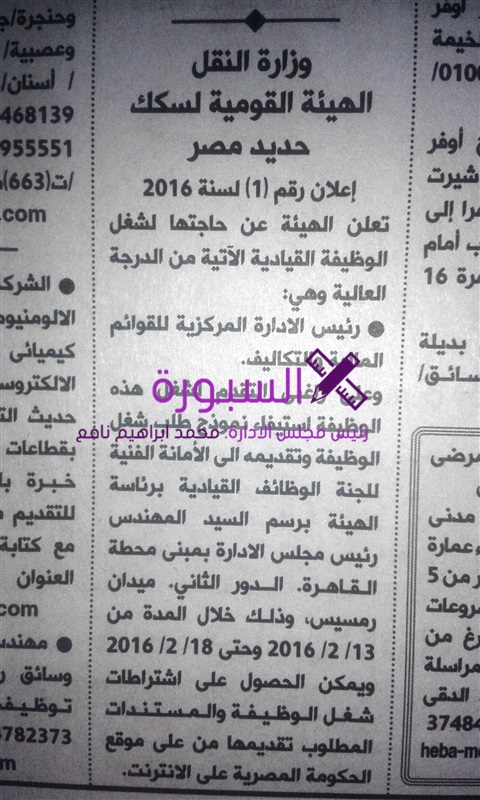 تعلن وزارة النقل "الهيئة القومية لسكك حديد مصر" عن حاجتها لشغل عدد من الوظائف قيادية للمؤهلات العليا، وعلى الراغبين فى التقدم استيفاء طلب شغل وظيفة وتقديمه الى السيد المهندس رئيس مجلس الادارة بمبنى محطة القاهرة/ الدور الثانى/ ميدان رمسيس، وذلك خلال المدة من 13 فبراير حتى 18 فبراير الجارى.