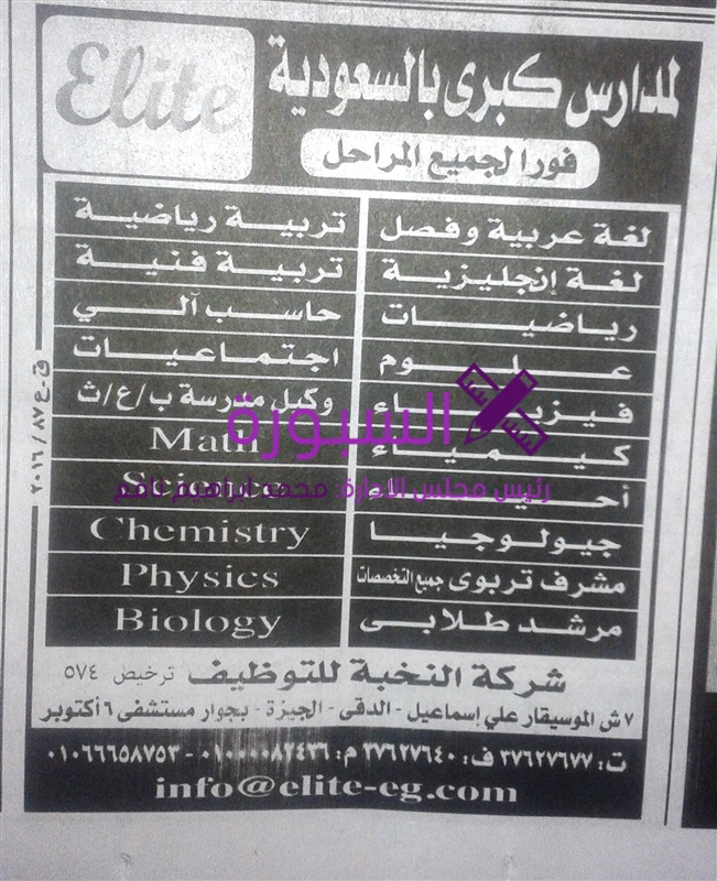 تعلن مدارس كبرى بالمملكة العربية السعودية عن حاجتها الى معلمين فى جميع التخصصات، وعلى الراغبين فى التقدم الاتصال بالارقام التالية 01066658753/ 01000082426 /27627677