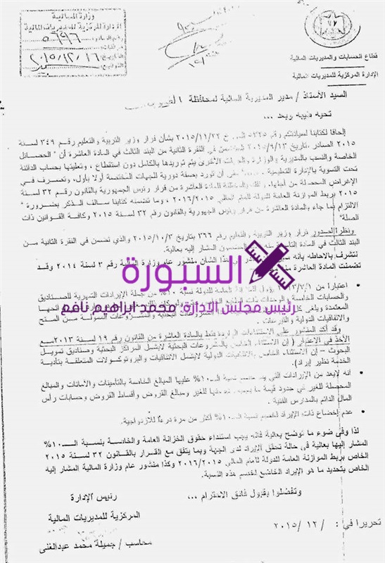 وقد ارسلت وزارة المالية خطابين للمديريات بمخالفة كلا القرارين الوزاريين رقم 349 لسنة 2015 و366 لسنة 2015