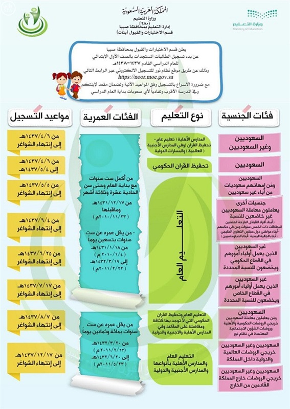 وقال مدير التعليم بمحافظة صبيا الدكتور عسيري بن أحمد الاحوس أن الإدارة ستقوم بقبول الطلاب والطالبات الذين يكملون ست سنوات في أول يوم من أيام العام الدراسي المقبل 2016/2017 ومن تقل أعمارهم عن هذا السن يتم التجاوز عنهم في حدود 90 يوماً لمن تاريخ ميلاده في 18 / 1 / 1431 هـ الموافق 4 / 1 / 2010م حتى 1432/3/19هـ الموافق 2011/2/22م كحد أدنى.