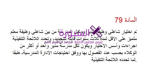 يتم اختيار شاغلى وظيفة مدير ووكيل المدرسة من بين شاغلى وظيفة معلم متميز على الاقل لمدة ثلاث سنوات قابلة للتجديد، وتحدد اللائحة التنفيذية اجراءات وأسس الاختيار ويكون لكل مدرسة مدير واحد أو أكثر من الوكلاء بحسب عدد الفصول بها ووفق احتياجات الادارة المدرسية، طبقا لما تحدده اللائحة التنفيذية.