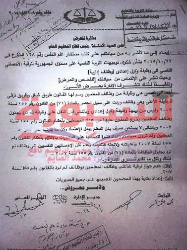 أكدت الادارة العامة للشئون القانونية بوزارة التربية والتعليم عدم جواز ترقية شاغلى وظائف المعلمين بوظائف لم ترد بالقانون رقم 155 لسنة 2007، وذلك بعد شكاوي توجيهات التربية النفسية على مستوى الجمهورية لترقية الاخصائى النفسى الى وظيفة وكيل اعدادى (وظائف ادارية) .