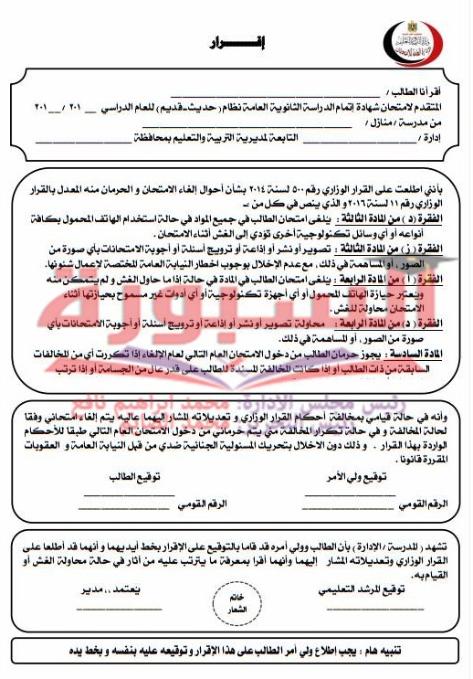 وفى سياق ذلك سيقوم الطالب اثناء ملئ استمارة التقديم للامتحان الامضاء على الاقرار والتوقيع عليه، بالاضافة الى توقيع ولى امره، بالاضافة الى توقيع مدير المدرسة، وختم شعار الجمهورية لكى يلتزم الطالب بكل بنود الاقرار ويكون مسئول عن مايصدر فى حالات الغش.