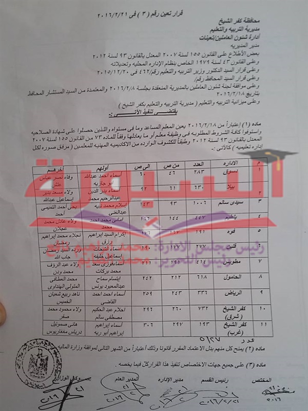 وافق اللواء السيد نصر، محافظ كفر الشيخ، علي تعيين 5127 معلما بتاريخ 18/2/2016 وترقيتهم من رتبة معلم مساعد الى معلم.