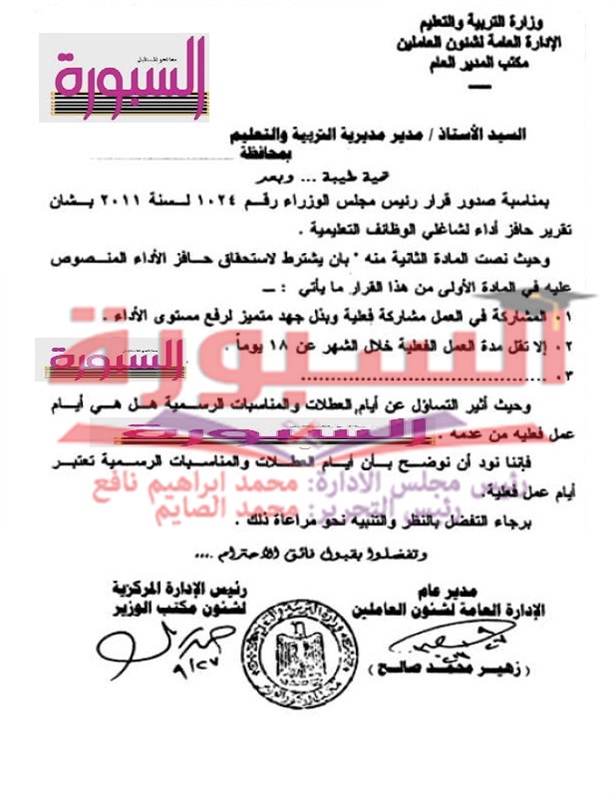 ينشر موقع السبورة التعليمى قرار رئيس مجلس الوزراء الخاص باحتساب حافز الآداء للمعلمين، حيث نصت المادة الثانية منه بان يشترط لاستحقاق حافز الآداء المنصوص عليه فى المادة الأولى من هذا القرار ما يأتى:-