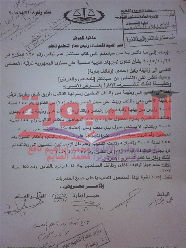 ينشر موقع "السبورة التعليمى" فتوى الإدارة العامة للشئون القانونية وإدارة الفتوى بوزارة التربية والتعليم بشأن أحقية أخصائى نفسى، وهى وظيفة من وظائف المعلمين وطرق ترقى الوظيفة الأعلى وهى وظائف وردت على سبيل الحصر بالمادة "71" من القانون رعم 155 لسنة 2007 وليس من بينها وظيفة وكيل إعدادى، وبالتالى فان النقل على وظيفة لم ترد بجداول وظائف المعلمين يخرج المنقول عليها من عداد المخاطبة بأحكام القانون رقم 155 لسنة 2007 وبالتالى لا يستحق صرف بدل المعلم وبدل الاعتماد.