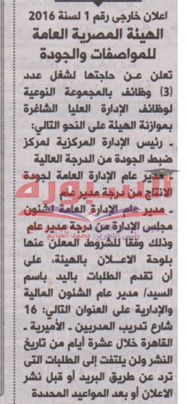 تعلن الهيئة المصرية العامة للمواصفات والجودة عن حاجتها الى شغل عدد 3 من الوظائف الادارية العليا بموزانة الهئية وهى كالتالى:-