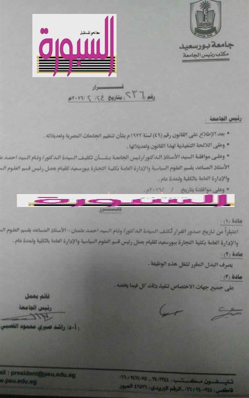 كما أصدر "القصبى" القرار رقم 236/2016 بتكليف الدكتورة وئام السيد أحمد عثمان، الأستاذ المساعد بقسم العلوم السياسية والإدارة العامة بكلية التجارة للقيام بعمل رئيس القسم لمدة عام.
