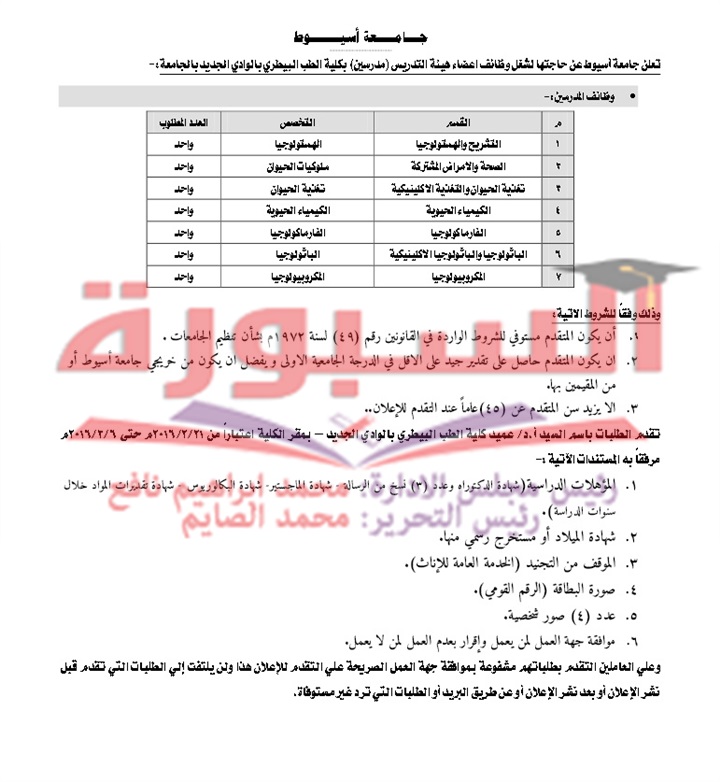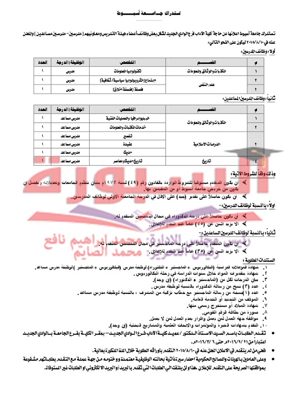 وتقدم الطلبات والمستندات باسم عميد كليتي "الآداب والطب البيطري فرع الوادي الجديد"، للإدارة العامة لشؤون أعضاء هيئة التدريس بالجامعة، وكلية التربية بأسيوط، جامعة أسيوط، أسيوط، وذلك في موعد غايته 6 مارس المقبل، ولن يلتفت إلى الطلبات التي ترد قبل أو بعد الميعاد المحدد أو بالبريد أو غير المستوفاة.