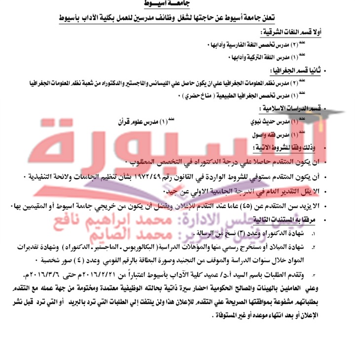 2- الحصول على بكالوريوس والماجستير في التخصص المطلوب، لوظيفة مدرس مساعد بكلية الآداب.