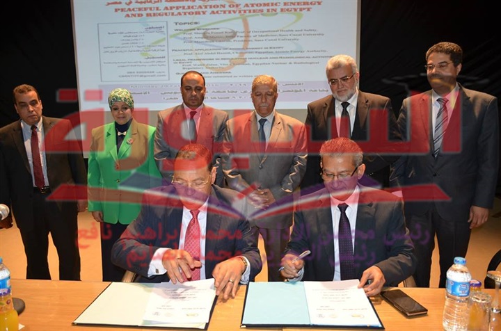 شهد اللواء يس طاهر, محافظ الاسماعيلية,و يرافقه الاستاذ الدكتور ممدوح غراب, رئيس جامعة قناة السويس, والاستاذ الدكتور عاطف عبد الحميد, رئيس هيئة الطاقة الذرية, و الاستاذ الدكتور وليد زيدان, نائب رئيس هيئة الرقابة النووية والاشعاعية, مراسم الاحتفال باليوم العلمي للاستخدامات السلمية للطاقة الذرية الذي نظمته جامعة قناة السويس لتوقيع بروتوكول التعاون ومذكرة التفاهم المشترك بين جامعة قناة السوبس وهيئة الطاقة الذرية في مجالات التعليم و التدريب و البحوث والسلامة الاشعاعية والاستخدامات السليمة للطاقة الذرية وسبل تفعيل التعاون مع كلية الطب بجامعة قناة السويس.