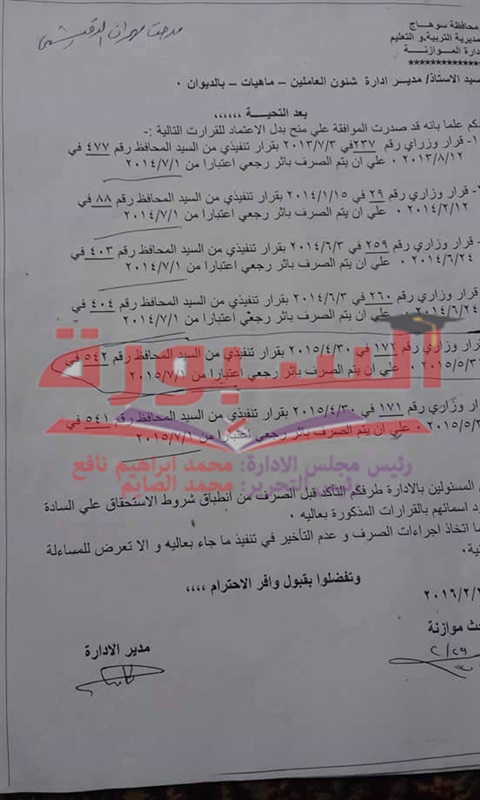 أرسلت مديرية التربية والتعليم بمحافظة سوهاج فاكسا بالموافقة علي منح بدل الاعتماد بأثر رجعي وذلك وفقا للقرارت التالية: