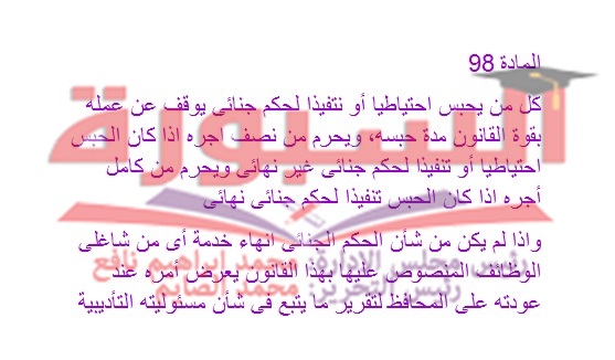 كل من يحبس احتياطيا أو نتفيذا لحكم جنائى يوقف عن عمله بقوة القانون مدة حبسه، ويحرم من نصف اجره اذا كان الحبس احتياطيا أو تنفيذا لحكم جنائى غير نهائى ويحرم من كامل أجره اذا كان الحبس تنفيذا لحكم جنائى نهائى.