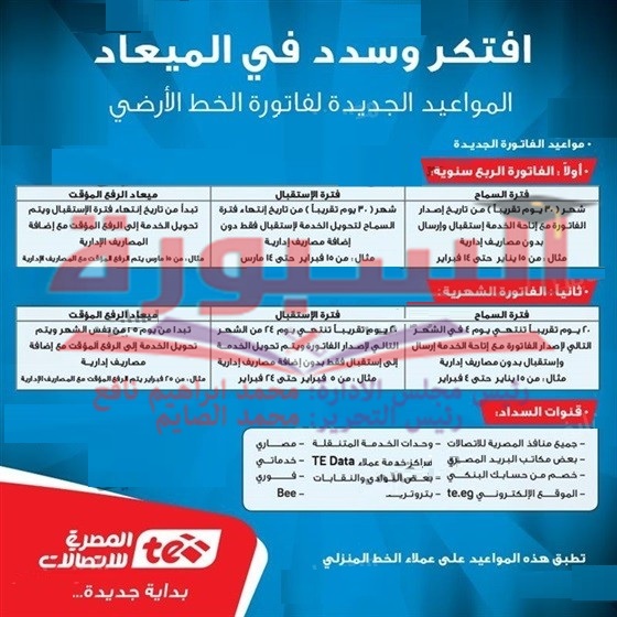 أعلنت الشركة المصرية للأتصالات المواعيد الجديدة لدفع فواتير التليفون الأرضي وذلك حتى لا تقوم الشركة برفع الخدمة مؤقتاً عن عملائها، حيث أشار الشركة أن فواتير التليفون الأرضي الجديدة تم تصنيفها إلى نوعين وهما :- فواتير شهرية تدفع كل شهر، فواتير ربع سنوية .