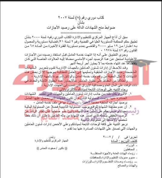 ننشر الكتاب الدورى رقم 8 بشأن ضوابط منح الشهادات الدالة على رصيد الاجازات، والذى قام بتحريره الجهاز المركزى للتنظيم والادارة، حيث نبه على صحة البيانات بالإجازات حال الخروج على المعاش للموظف لصرف رصيد الاجازات بأحد أقصى اربع شهور.