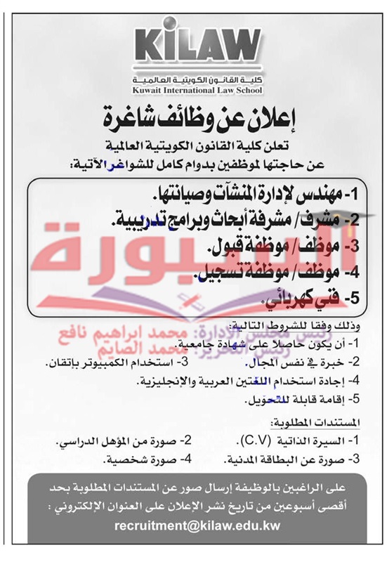 تعلن كلية القانون في دولة الكويت عن توافر وظائف شاغرة وذلك في التخصصات التالية: