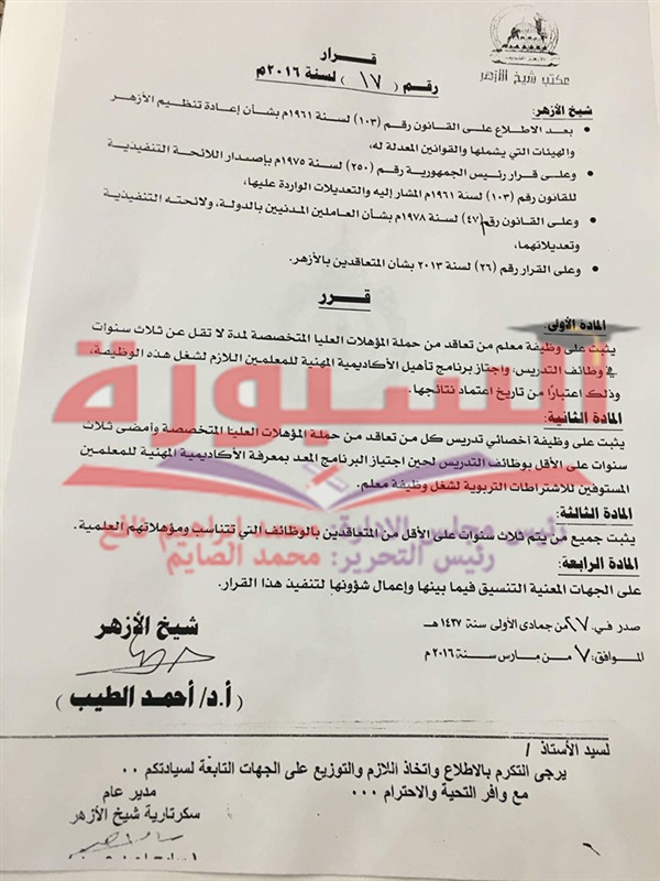 بالمستندات| الطيب يعلن تثبيت كل المعلمين المتعاقدين بالمعاهد الأزهرية