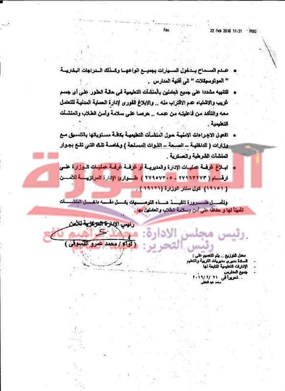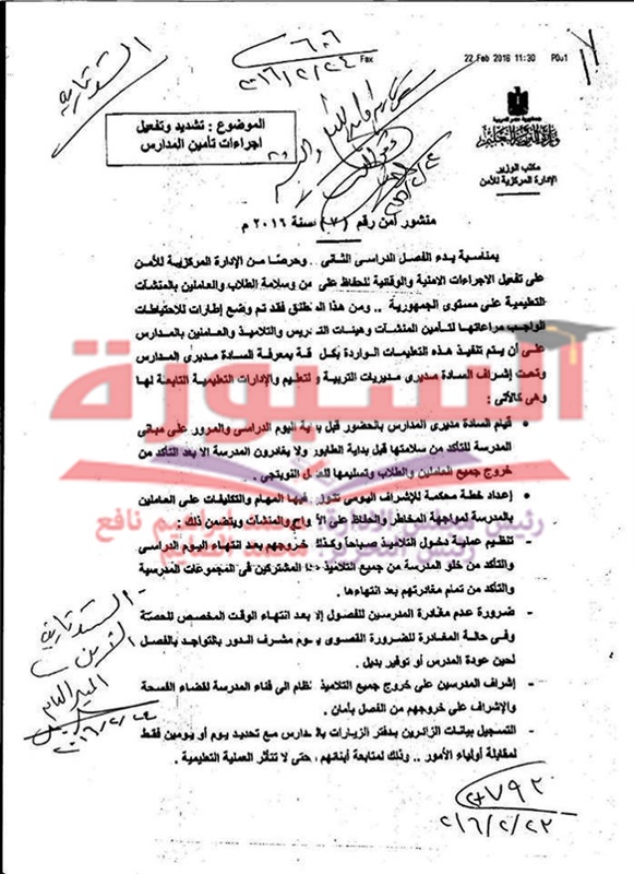ينشر موقع "السبورة التعليمى" منشور الأمن رقم 7 لسنة 2016 بالضوابط الجديدة التى يجب اتخاذها فى المدارس للحفاظ على سلامة الطلاب والعاملين بالمنئشات التعليمية على مستوى الجمهورية.