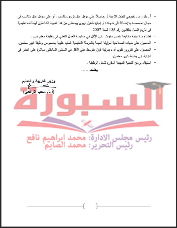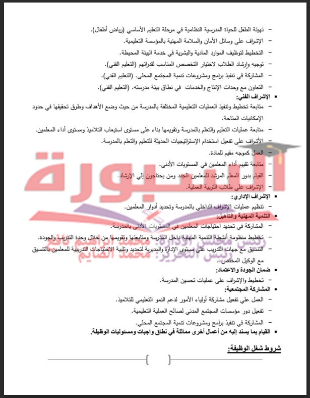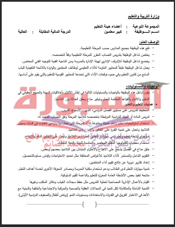 ينشر موقع السبورة التعليمى شروط شغل وظيفة كبير معلمين فى وزارة التربية والتعليم حسب التوصيف الوظيفى التى أعدته الوزارة بالتعاون مع الاكاديمية المهنية للمعلمين، وفيها الوصف العام للوظيفة، والواجبات والمسئوليات، والاشراف الفنى والادارى، وضمان جودة التعليم والاعتماد، والمشاركة المجتمعية.