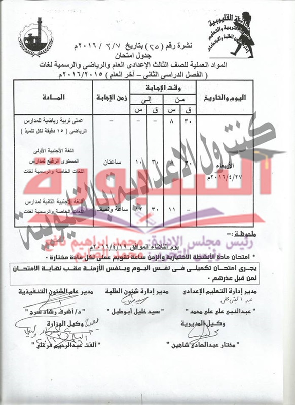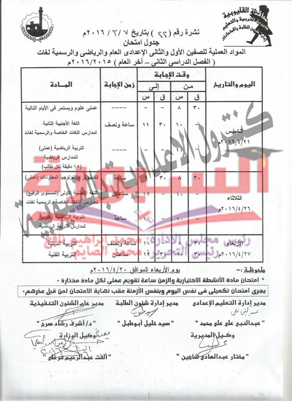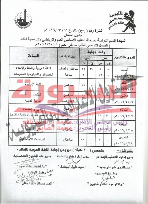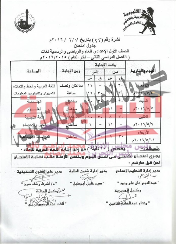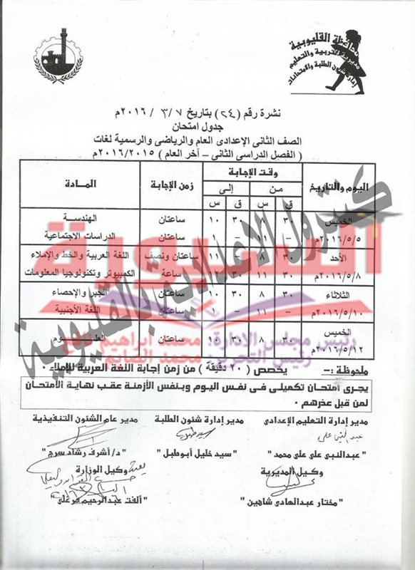 جدول امتحانات آخر العام لاعدادية القليوبية