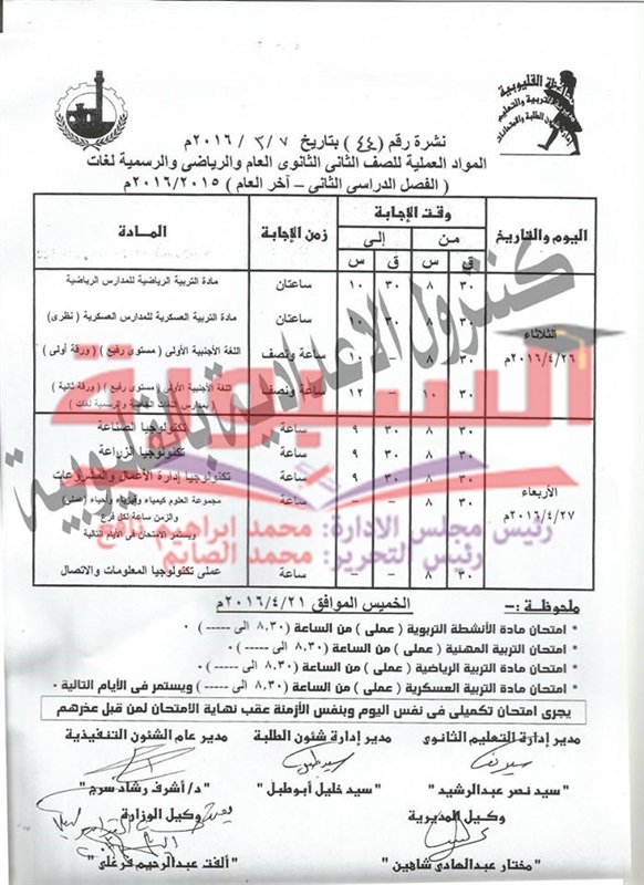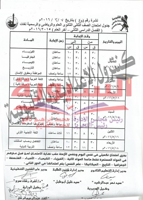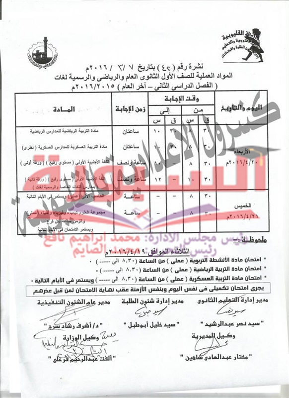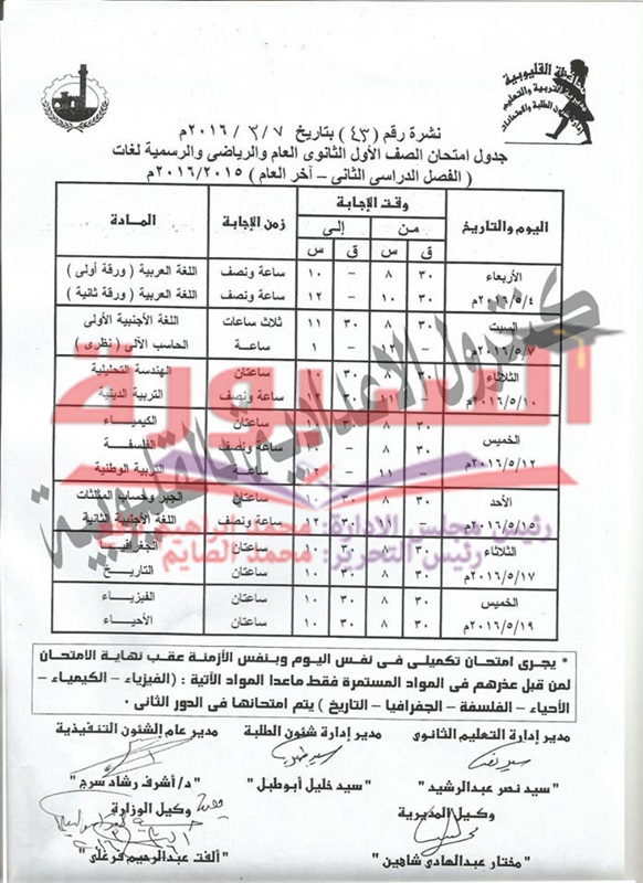 جدول امتحانات آخر العام للثانوى العام بالقليوبية