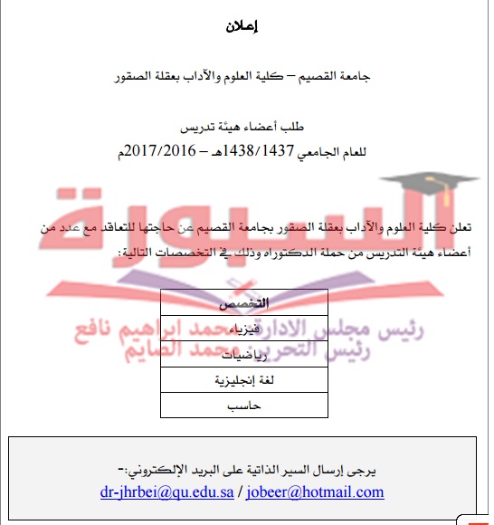 تعلن كلية العلوم والآداب بعقلة الصقور بجامعة القصيم عن حاجتها للتعاقد مع عدد من أعضاء هيئة التدريس من حملة الدكتوراه وذلك في التخصصات التالية :