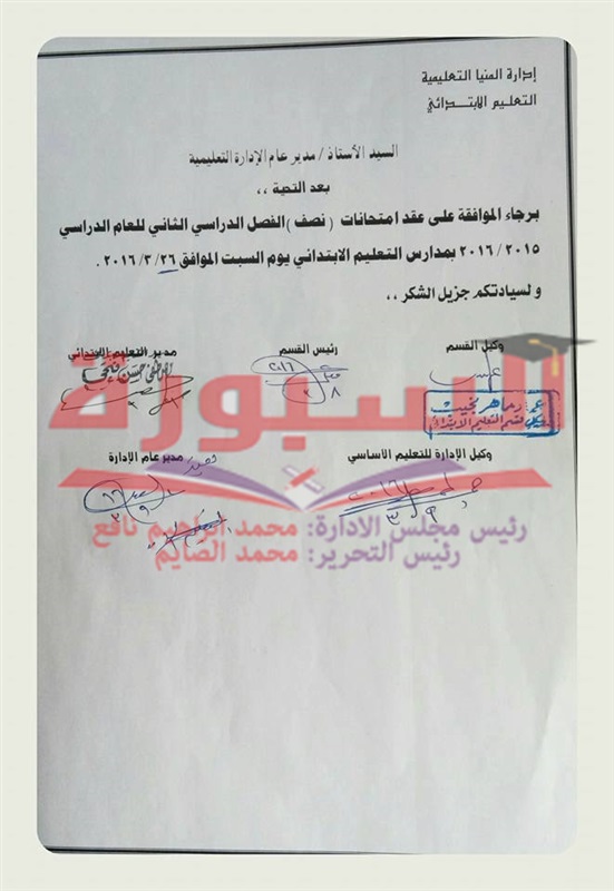 قررت مديرية التربية والتعليم بالمنيا إجراء امتحانات نصف الفصل الدراسى الثانى يوم السبت الموافق 3/26 لجميع مدارس التعليم الابتدائى بالمحافظة.