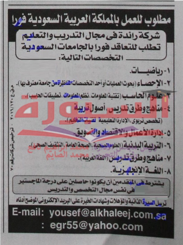 يعلن مركز تعليمي في المملكة العربية السعودية عن حاجته للتعاقد مع اعضاء هيئة تدريس للعمل في الجامعات وذلك في التخصصات التالية: