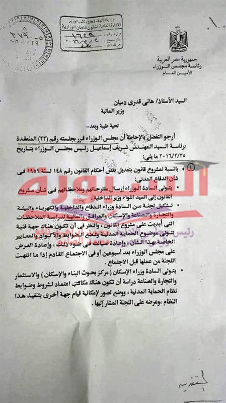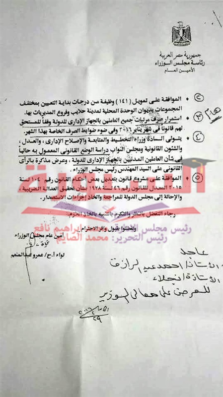 واشار رئيس الوزراء الى ضرورة ان تتولي وزارات التخطيط والمتابعة والاصلاح الاداري والعدل والشئون القانونية ومجلس النواب دراسة الوضع القانوني المعمول به حاليا بشأن العاملين المدنيين بالجهاز الاداري للدولة وعرض مذكرة بالرأي القانوني علي رئيس مجلس الوزراء.