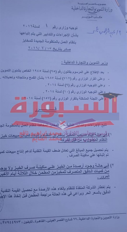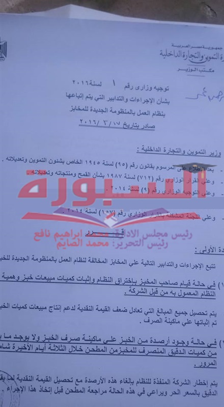 أصدر الدكتور خالد حنفي، وزير التموين والتجارة الداخلية، التوجيه الوزاري رقم 1 لسنة 2016، بشأن نظام التدابير الواجب اتخاذها للعمل بها في منظومة الخبز الجديدة.