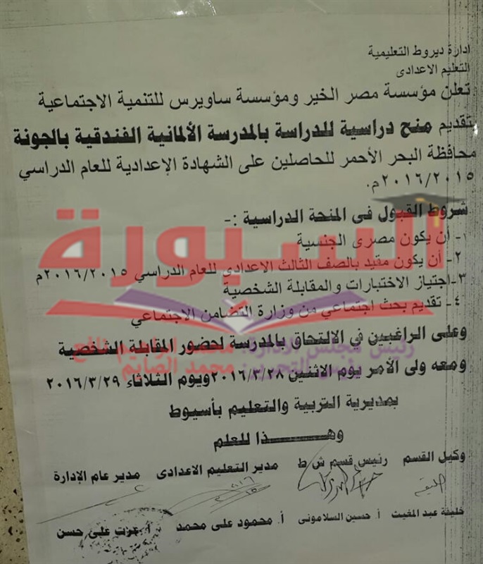 ينشر موقع السبورة شروط المنح الدراسية لطلاب الصف الثالث الاعدادى للالتحاق بالمدرسة الفندقية الألمانية بمدينة الجونة بمحافظة البحر الأحمر، والتى تقدمها مؤسستى مصر الخير وساويرس للتنمية الاجتماعية للعام الدارسى 2016/2015.