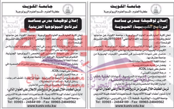 تعلن جامعة الكويت عن حاجتها الى اعضاء هيئة تدريس لشغل وظيفة (مدرس مساعد) للعام الجامعى 2017/2016، حسب الشروط الموضحة فى الاعلان المنشور ادنى الخبر، وعلى الراغبين فى التقدم الرسال السيرة الذاتية فى غضون شهربن من تاريخ الاعلان على العنوان التالى: ادارة شئون اعضاء الهيئة الاكايمية/ فسم تعيينات اعضاء هيئة التدريس/ جامعة الكويت/ قطعة 3/ شارع الفردوس/ دولة الكويت.