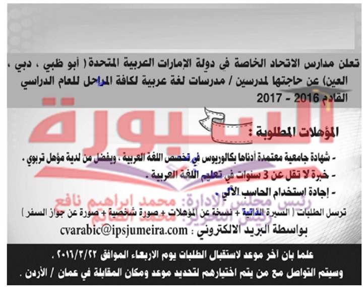 تعلن مدارس الاتحاد بدولة الامارات العربية المتحدة عن وظائف شاغرة للمعلمين وذلك في التخصصات التالية