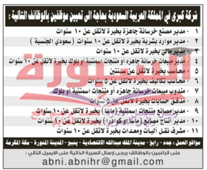 تعلن احدى الشركات الكبرى بالمملكة العربية السعودية عن حاجتها الى توظيف عدد من الشباب من حملة المؤهلات العليا، وعلى الراغبين فى التقدم ارسال السيرة الذاتية على الايميل التالى: [email protected]