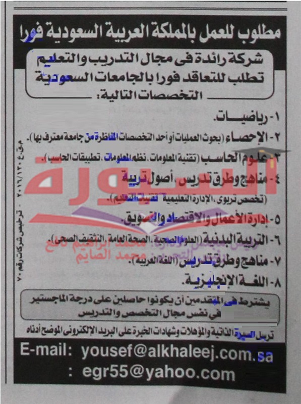 تعلن شركة متخصصة في مجال التعليم بالمملكة العربية السعودية عن وظائف ِشاغرة لاعضاء هيئة التدريس وذلك في التخصصات التالية
