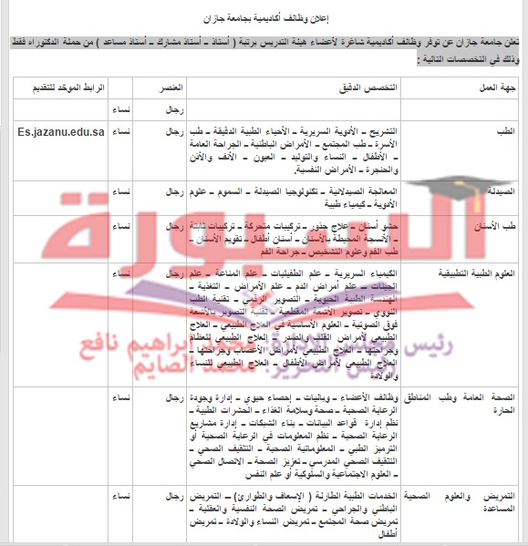 تعلن جامعة جازان بالمملكة العربية السعودية عن توفر وظائف أكاديمية شاغرة لأعضاء هيئة التدريس برتبة ( أستاذ ــ أستاذ مشارك ــ أستاذ مساعد ) من حملة الدكتوراه فقط وذلك في جميع التخصصات، ولمزيد من التفاصيل اضغط هناااااااااااااا.