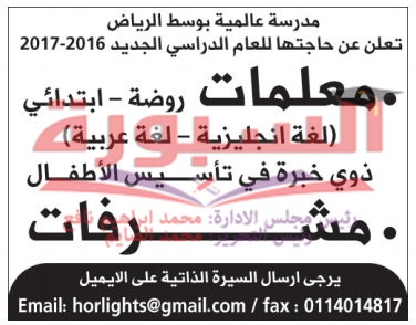 تعلن مدرسة عالمية بوسط الرياض عن حاجتها الى معلمات للعام الدراسى 2017/2016، فى جميع التخصصات والشروط والتفاصيل عبر الاعلان التالى: