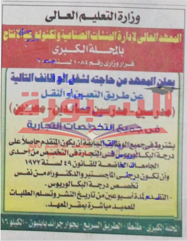 "التعليم العالي" تعلن عن وظائف لاعضاء هيئة التدريس من "معيد الي أستاذ" وذلك من خلال المعهد العالي لإدارة المنشات الصناعية وتكلنولوجيا الانتاج في التخصصات التالية: