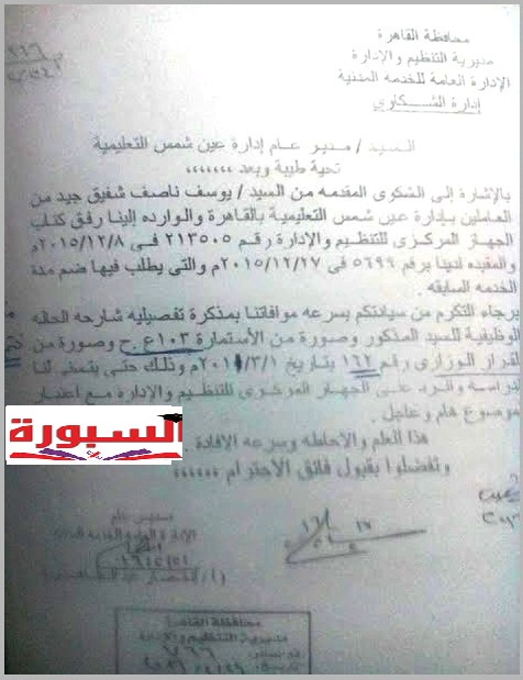 قامت مديرية التنظيم والادارة لمخاطبة ادارة عين شمس التعليمية بشأن ارسال مذكرة تفصيلية بخصوص طلب يوسف ناصف.. من ضمن العاملين بالادارة التعليمية لضم مدة العمل والخدمة السابقة وذلك حتى يتم دراسة الحالة من قبل الجهاز المركزى للتنظيم والادارة "بدون اى قضايا"