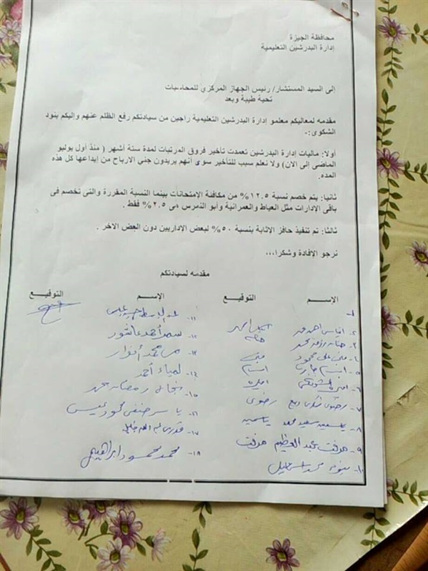 بالمستندات ..شكوي من معلمي البدرشين للمركزي للمحاسبات بسبب تأخير صرف فروق الرواتب