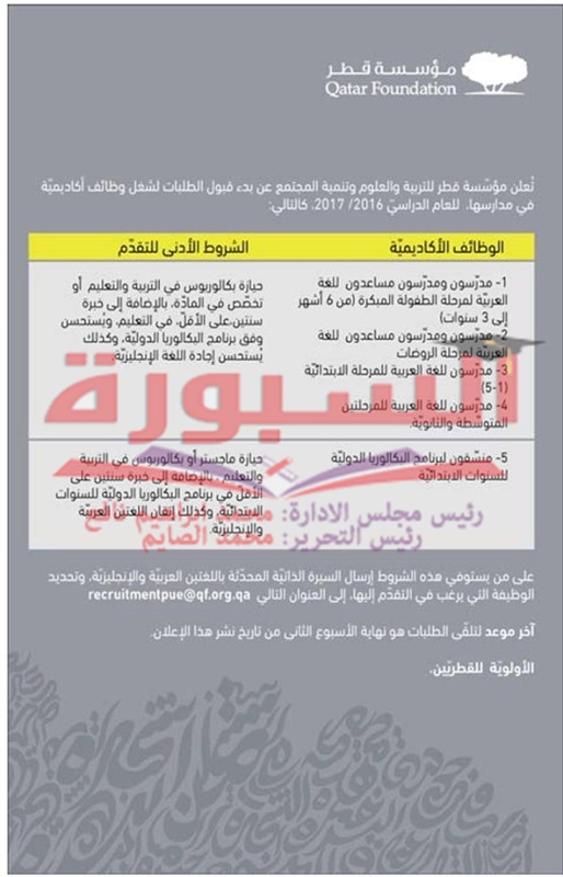 تعلن مؤسسة قطر للتربية والعلوم وتنمية المجتمع عن بدء قبول الطلبات لشغل وظائف اكاديمية فى مدارسها للعام الدراسى 2017/2016، والتخصصات طبقا للمنشور فى الاعلان التالى