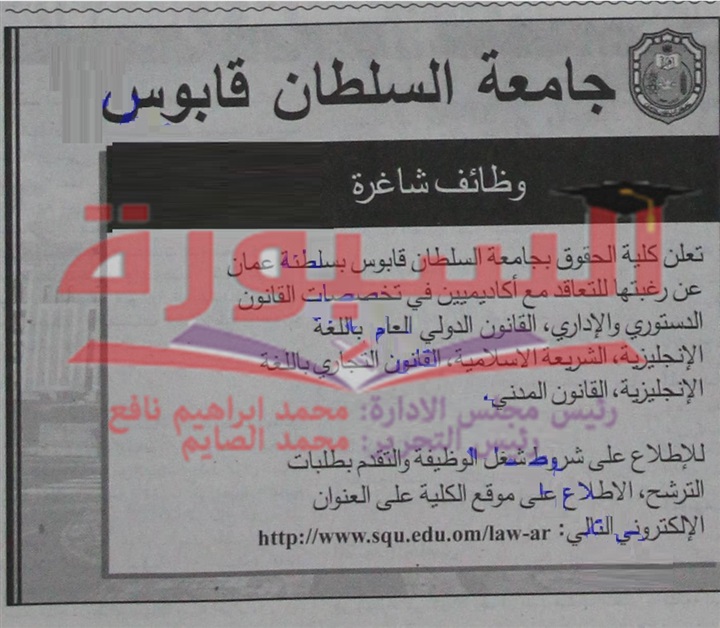 تعلن جامعة السلطان قابوس عن وظائف شاغرة لأعضاء هيئة التدريس وذلك وفقا للشروط التالية: