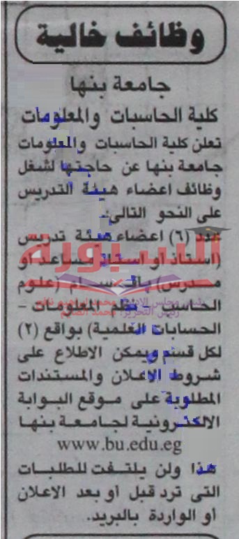 تعلن جامعة بنهاعن شاغرة لأعضاء هيئة التدريس وذلك في التخصصات التالية: