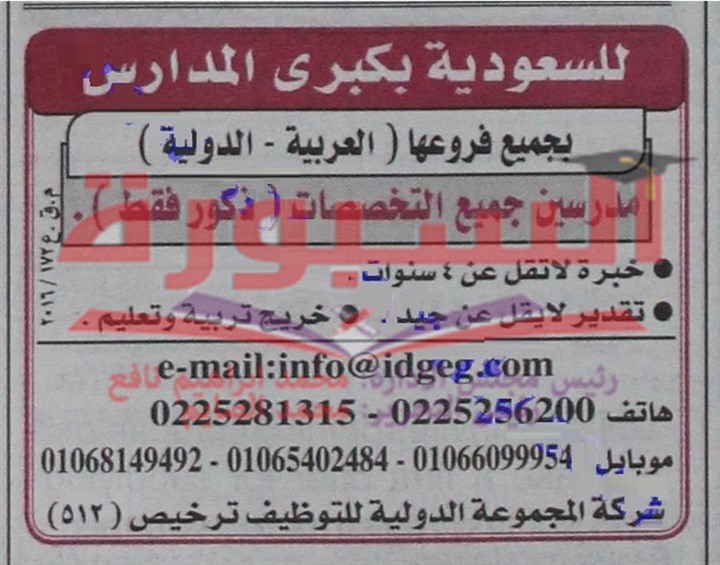 تعلن عدد من المدارس الكبري بالمملكة العربية السعودية عن وظائف شاغرة للمعلمين في جميع المواد بمرتبات مجزية وذلك وفقا للشروط التالية: