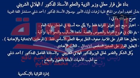 وأضاف أن هذا القرار يطبق على تلاميذ صفوف النقل بمرحلة التعليم الأساسى فقط "للمرحلتين الابتدائية والاعدادية"، ولا يطبق على الصفين السادس والثالث الاعدادى.