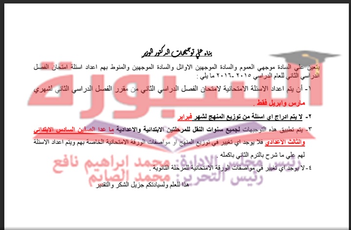 وتم التنبيه على موجهي العموم والموجهين الاوائل والموجهين والمنوط بهم اعداد اسئلة امتحان الفصل الدراسي الثاني للعام الدراسي 2015 -2016 ما يلي: